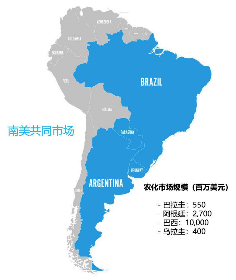 The map shows the size of the members of the South American Common Market Trading Group and its agrochemical market